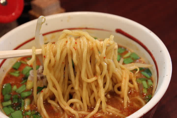 カネジン製の中太麺が、この辛いスープによく合ってます。